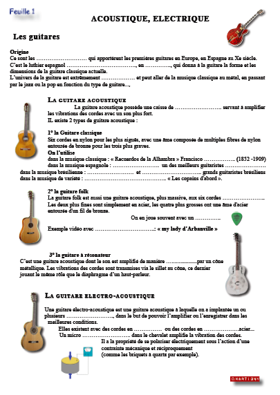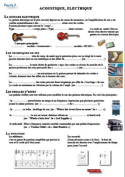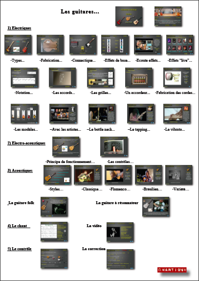 Les guitares ...Origine et Fabrication.. Acoustique: ,classique, flamenco, brésilien, variété... Folk et à résonnateur... Electroacoustique: principe... Un accordeur... Electrique, fabrication... Les modèles de guitares... La connectique...Les effets.... Vidéo " Techniques " ... La notation "tablature et des accords"... Un chant "Every breath you take" ... Le contrôle... |