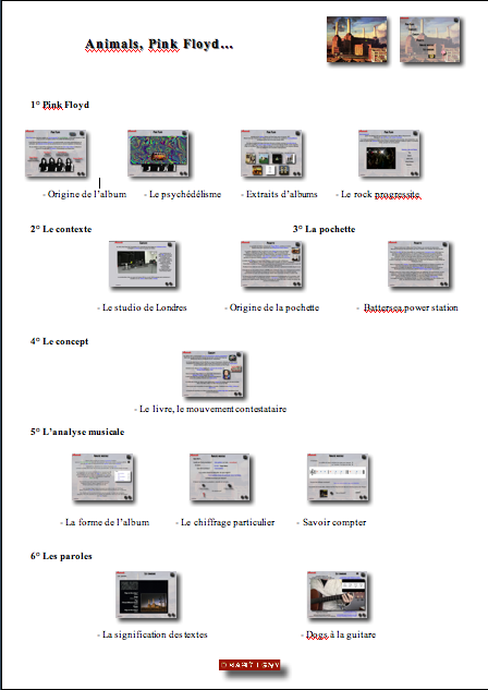 Animals des Pink Floyd ....Pink Floyd: Le rock progressif... L'album-concept... Le mouvement psychédélique ... La ferme des animaux, G. Orwell ... Le artwork et les groupes progressistes... le contexte: le studio de londres Britania row. La cocept: les punks, M.Thatcher ... La pochette: Agie, battersea power station... L'analyse musicale: la forme, le chiffrage... Les paroles: traduction et sens ... Le long métrage animé .... Le test... |