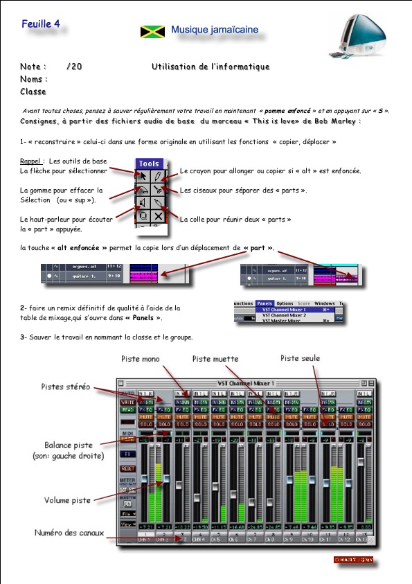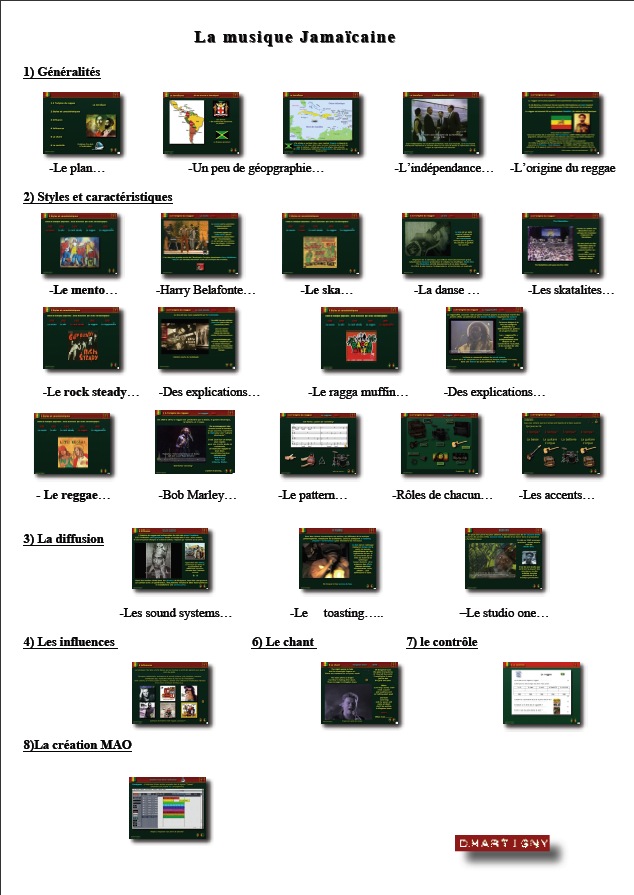 La musique jamaïcaine...Généralités, historiques et géographiques... Styles et caractèristiques... Le mento: H.Bellafonte... Le ska, le contretemps aux tubes... Le rock steady... Le reggae, le pattern, le rôle de chacun... Le raggamuffin, ... La diffusion, le sound system, le dub, le rap... Les influences... Le chan "kingston town"... Le contrôle... Création à l'ordinateur d'un dub... |