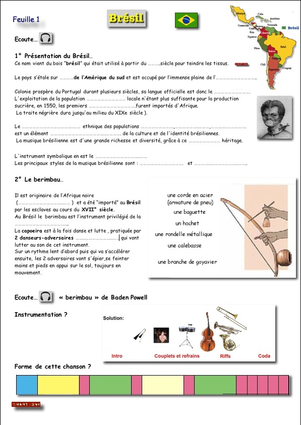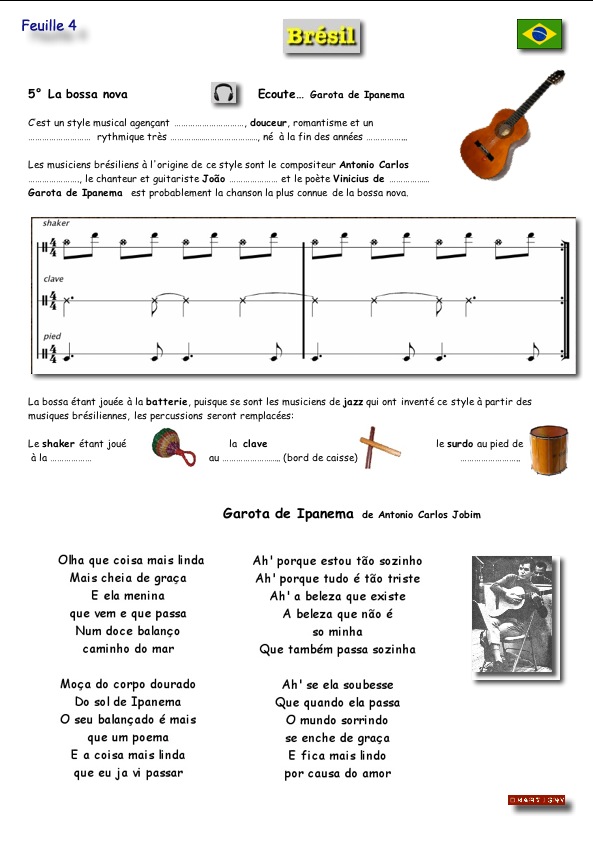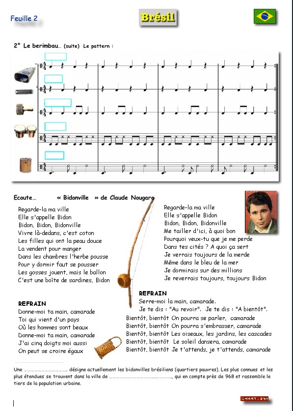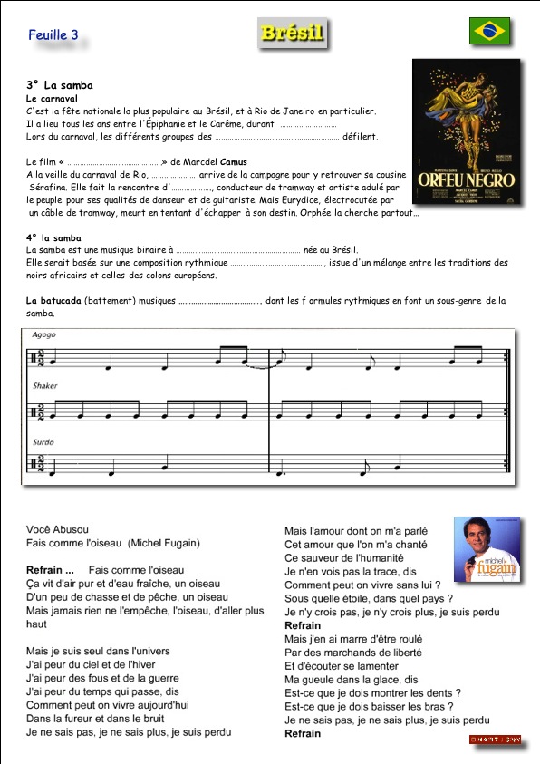 Le Brésil......Généralités du brésil...Le métissage et le triple héritage culturel... Le berimbau , origine... La capoeira, le jeu du berimbau... Le morceau: instrumentation et forme... Le pattern joué aux percussions... Les favelas, au chant "bidonville", C. Nougaro... La samba: le carnaval, Orfeo negro... La batucada, les instruments, la cuica... Le pattern joué, le chant "voce abusou"... La bossa nova, le pattern, le chant "garota"... Le contrôle... |