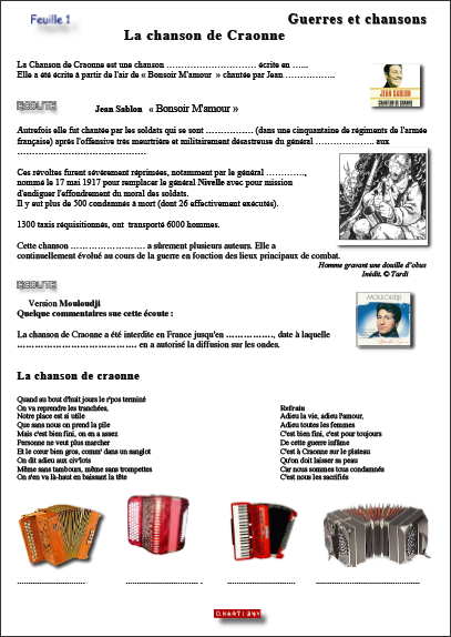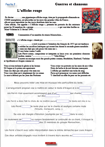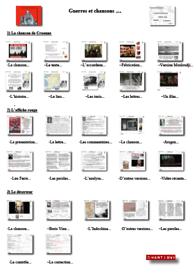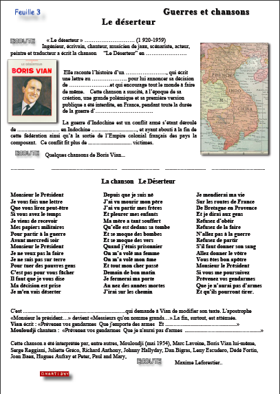 Guerres et chansons....La chanson de Craonne... Une vidéo de la chanson, l'horreur... L'origine du texte et de la mélodie... L'histoire, l'interprète Mouloudji... L'affiche rouge...La lettre, le contexte... La chanson, Leo Ferré, analyse musicale... Une version moderne (rap)... Le deserteur...La chanson, Boris Vian... Différentes versions, le chant... Le chant des partisans.... Le contrôle... |