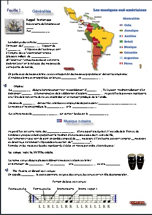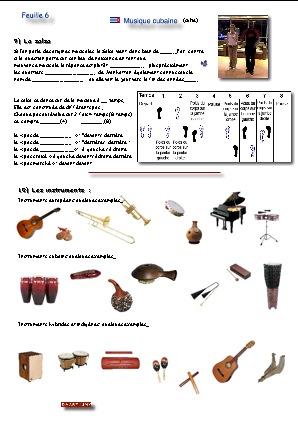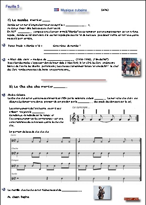 La musique cubaine...Généralités historiques et géographiques... Cuba, la pays... Les instruments, origines et mélanges... La conga, tumbao et percussions... La rumba, la habanera, Carmen... Le danzon, pattern percussions... Le bolero, au chant Quizas... Le son: le udu, le très.. .Au chant "Chan chan"... Le mambo: "West side story"... Le chachacha, au chant "Pépito"... La salsa: pas de base dansés... Le contrôle... |