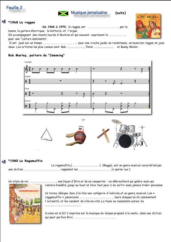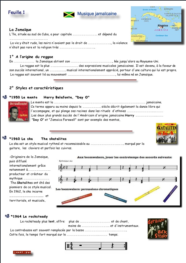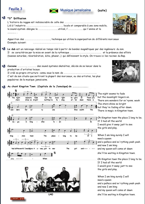 La musique jamaïcaine...Généralités, historiques et géographiques... Styles et caractèristiques... Le mento: H.Bellafonte... Le ska, le contretemps aux tubes... Le rock steady... Le reggae, le pattern, le rôle de chacun... Le raggamuffin, ... La diffusion, le sound system, le dub, le rap... Les influences... Le chan "kingston town"... Le contrôle... Création à l'ordinateur d'un dub... |