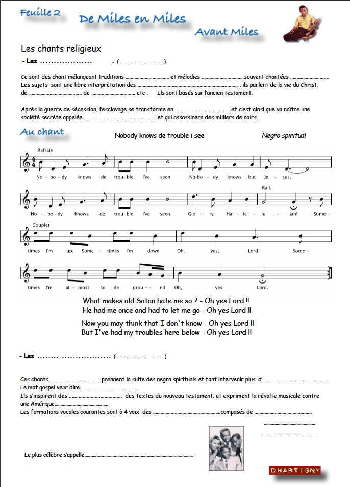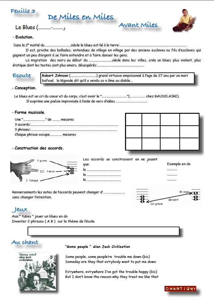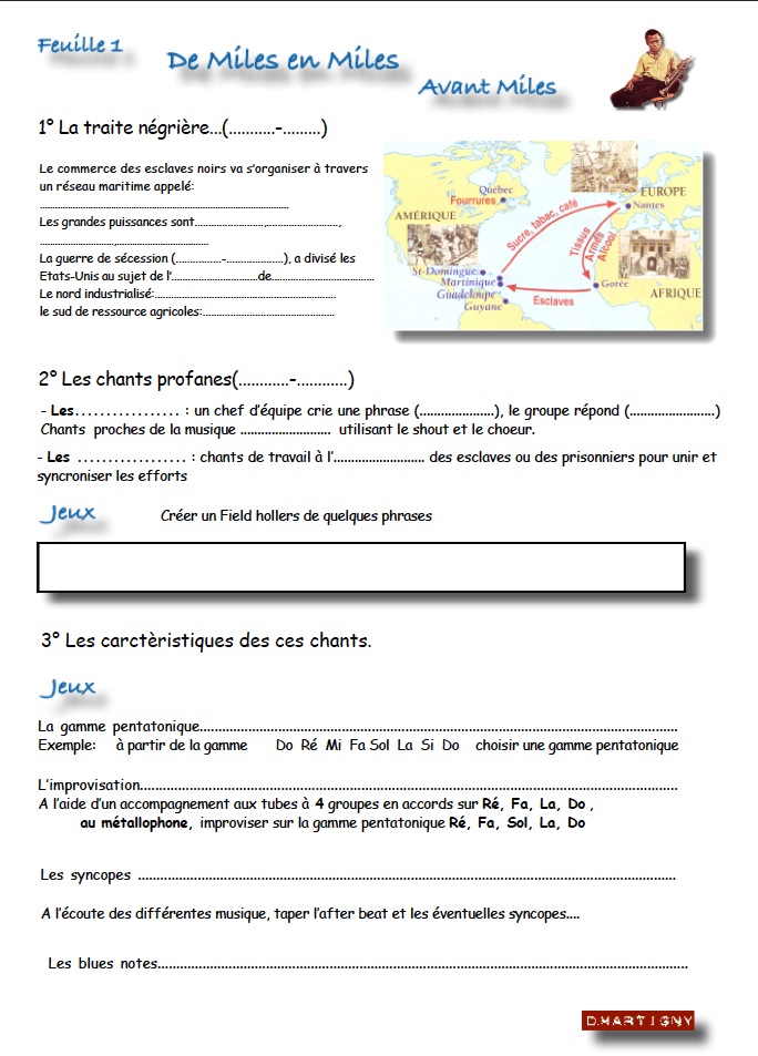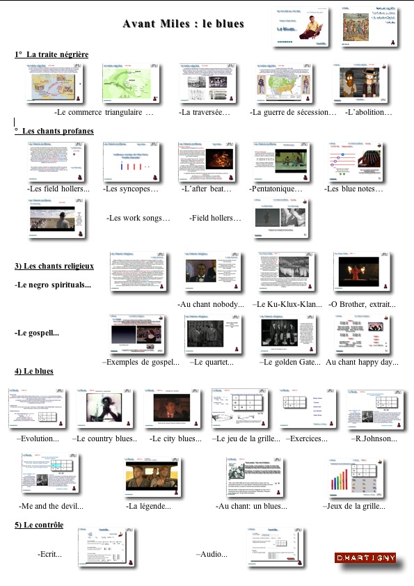 Avant Miles, le blues......La traite négrière... La traversée, la guerre de sécession, l'abolition... Les chants profanes, les field hollers... Les syncopes, l'afterbeat, pentatoniques et blue notes... Les worksongs: un chant "Sing Sing song"... Les chants religieux, origine... Le negro spiritual, au chant "Nobody knows"... Le gospel: au chant "O Happy day... Le blues, country blues et city blues... Robert Johnson la légende... jeux du blues: grille et improvisation... Le contrôle... |